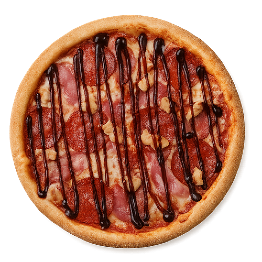 Соус красный, Сыр моцарелла, Бекон, Ветчина, Пеперони, Куриное филе, Соус барбекю