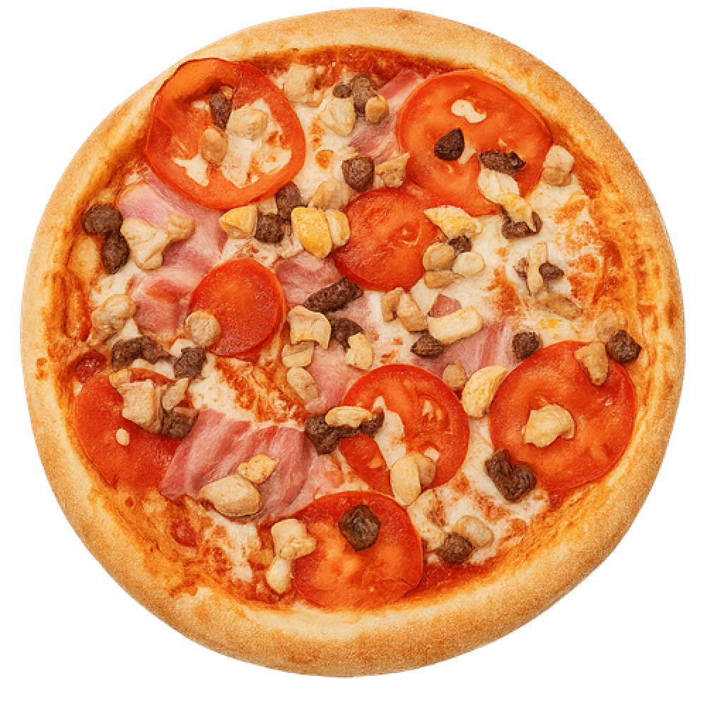 Соус красный,Сыр моцарелла, Бекон, Свинина, Говядина, Свежие томаты, Куриное филе