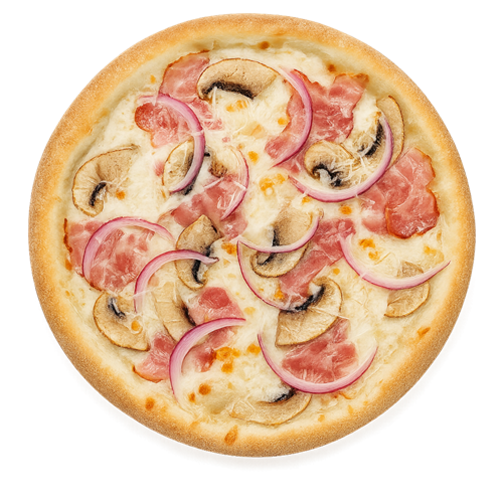 Соус белый, Сыр моцарелла, Бекон, Шампиньоны, Лук красный, Пармезан