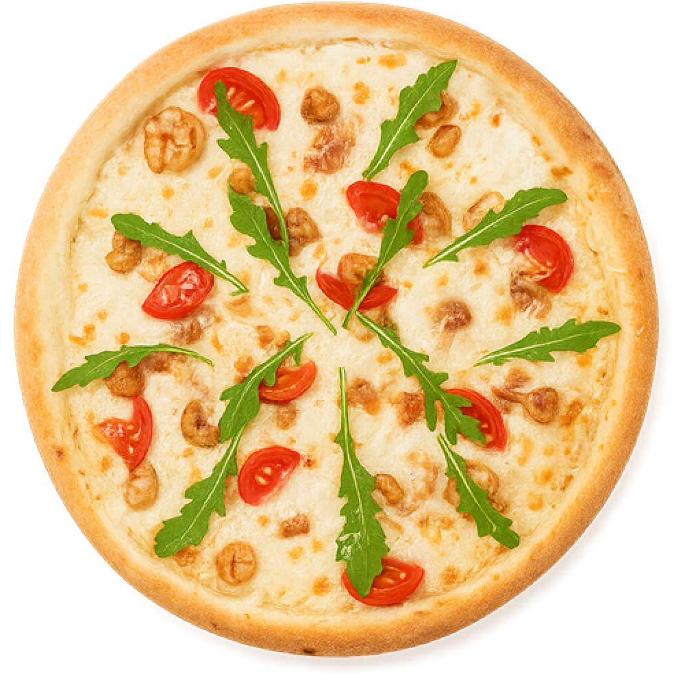 Соус белый, Сыр моцарелла, Форель, Креветка, Кальмар, Помидор черри, Руккола, Пармезан