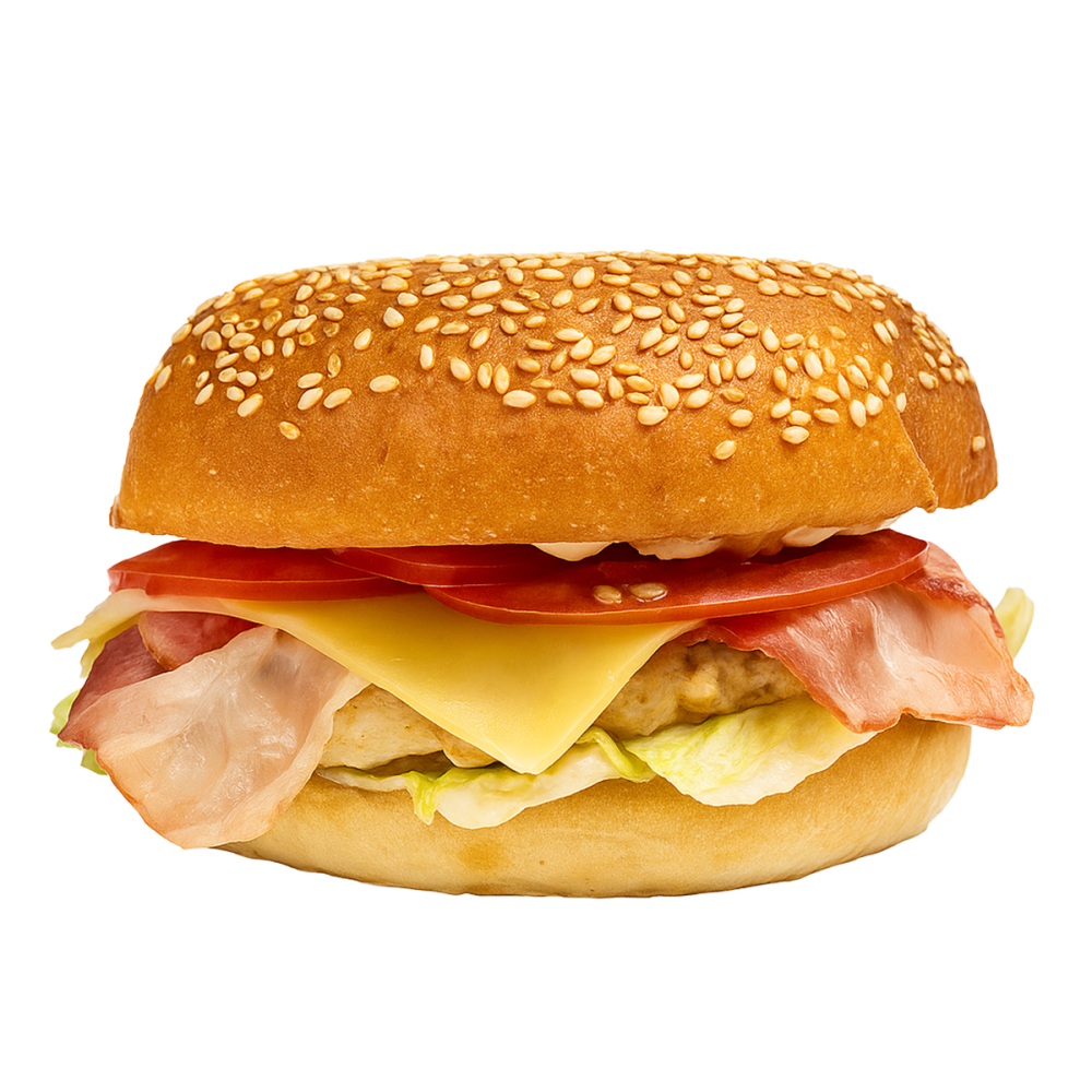 Булочка картофельная, Соус Цезарь, Котлета куриная, Бекон, Айсберг, Свежие томаты, Сыр гауда