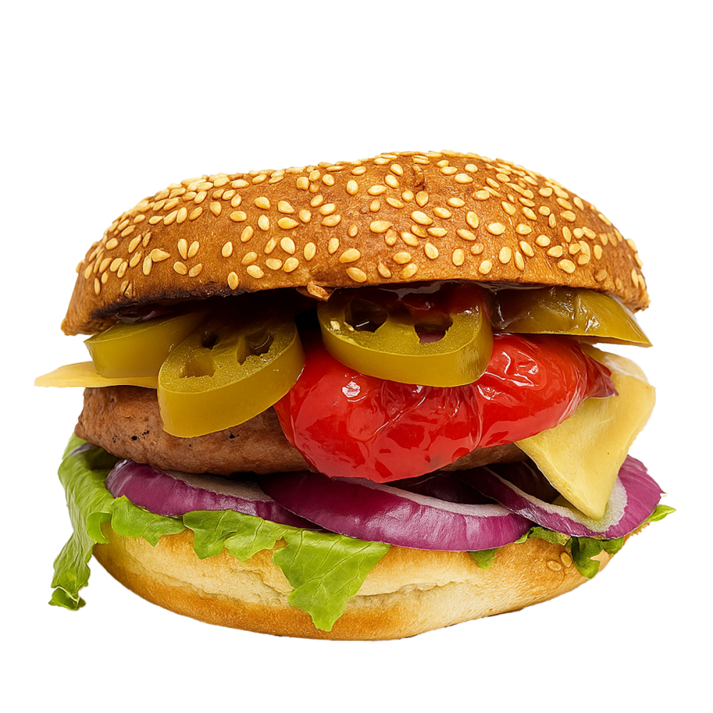Булочка картофельная, Соус барбекю, Котлета говяжья, Айсберг, Болгарский перец гриль, Лук красный, Перец холопеньо, Сыр гауда