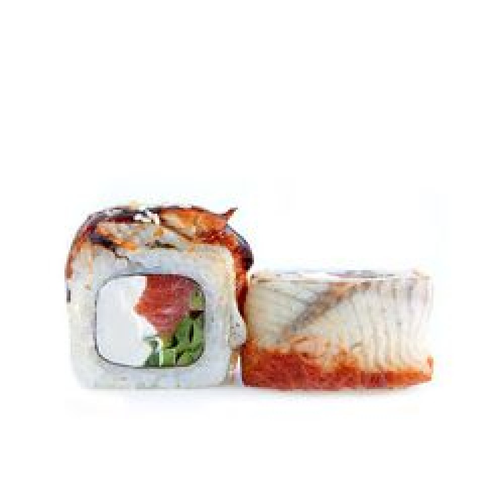 Рис, Норри, Сыр сливочный, Огурец, Угорь, Лосось с/с, Соус унаги, Кунжут