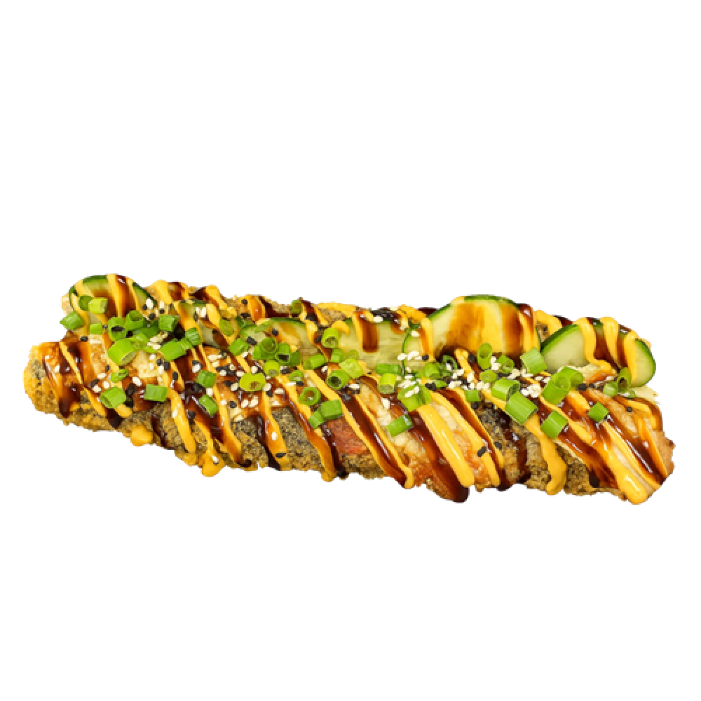 Рис, Норри, Сыр Сливочный, снежный краб, Темпура, Панко, Огурец, Соус острый, Соус унаги, Лук зелёный, Кунжут