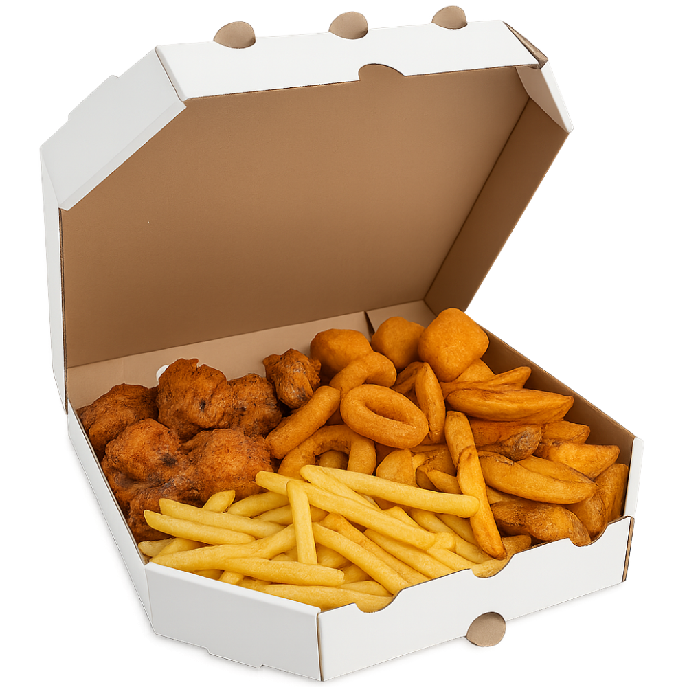 Картофель фри 150г, Картофель по-деревенски 200г, Наггетсы куриные 6шт, Луковые кольца 6шт, Крылья буффало 6шт