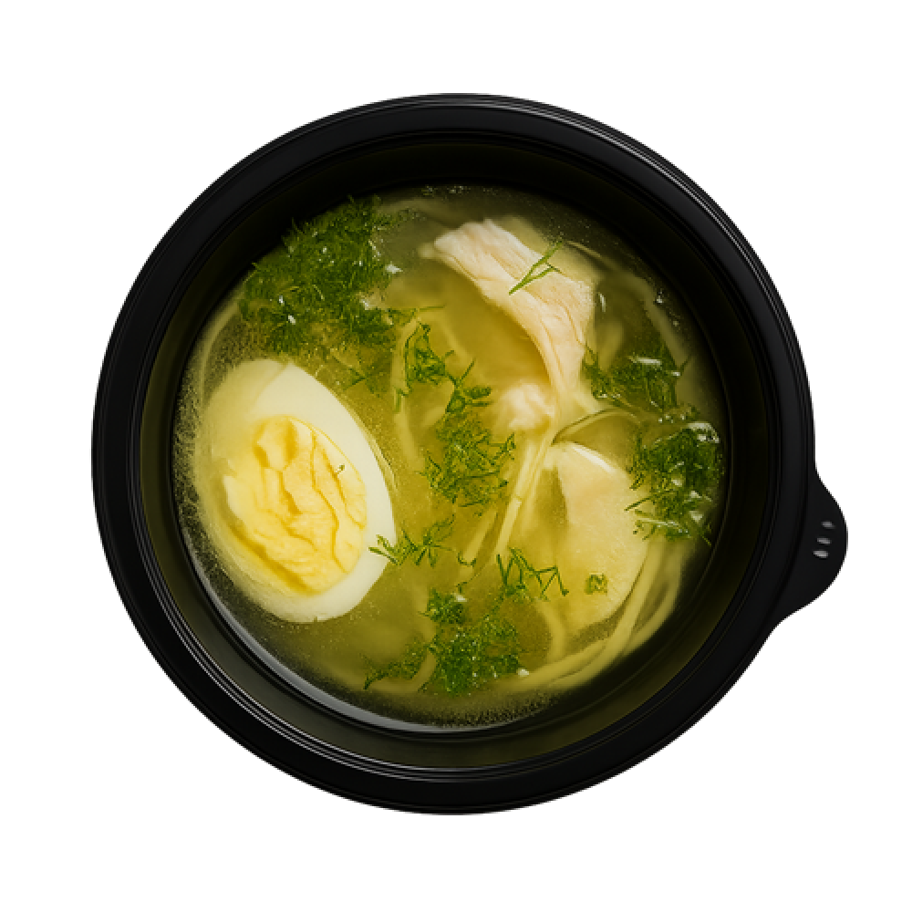 Бульон куриный, Окорочок куриный, Лапша удон, Укроп, Яйцо куриное 0.5, Специи