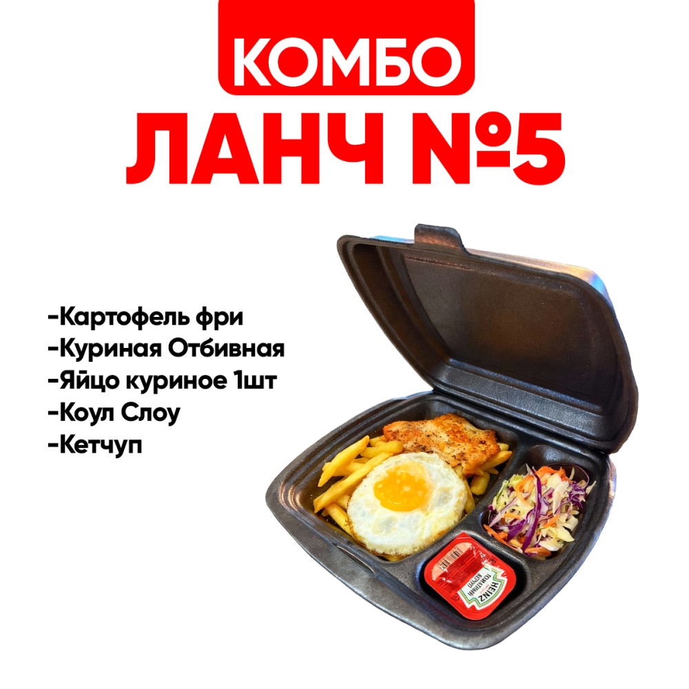 Картофель фри, Куриная отбивная, Яйцо куриное, Салат Клоу Слоу, Кетчуп 1шт.