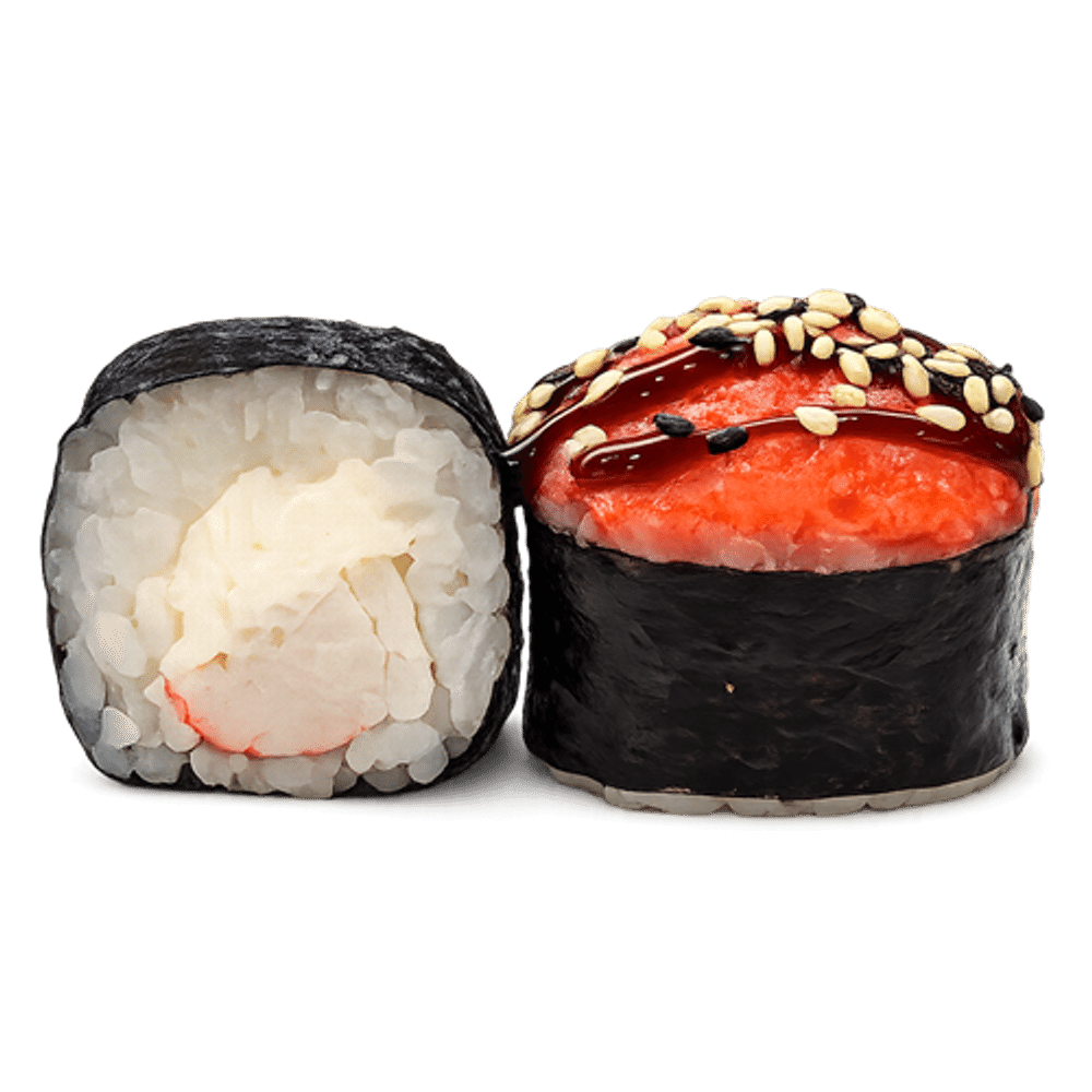 Рис, Норри, Сливочный сыр, Снежный краб, Соус унаги, Кунжут. Шапка: Майонез, Моцарелла, Острый соус.