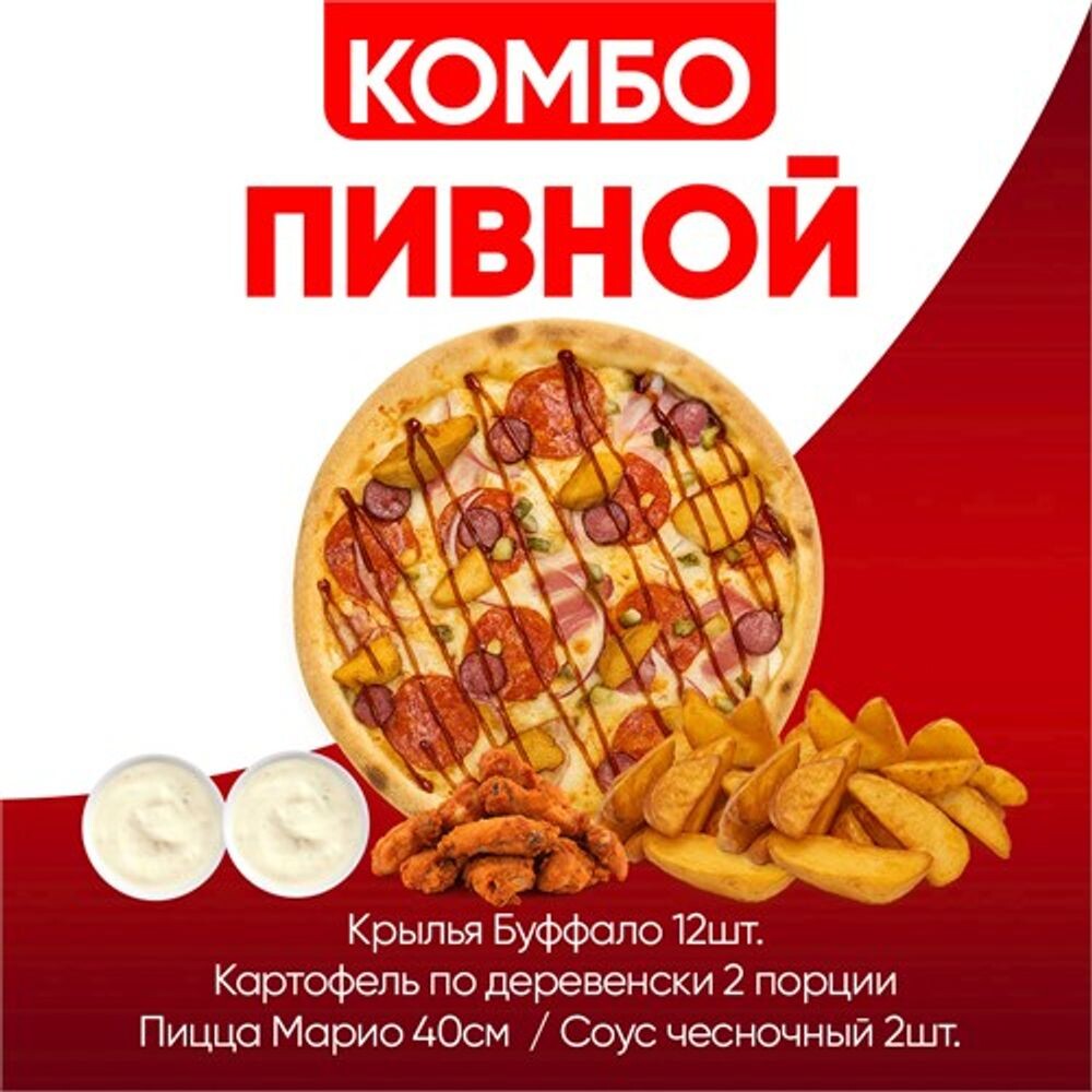 Крылья Буффало - 12шт.; Картофель по-деревенски 2 порц.; Пицца 40см. "Марио"; 2 соуса горчичных.