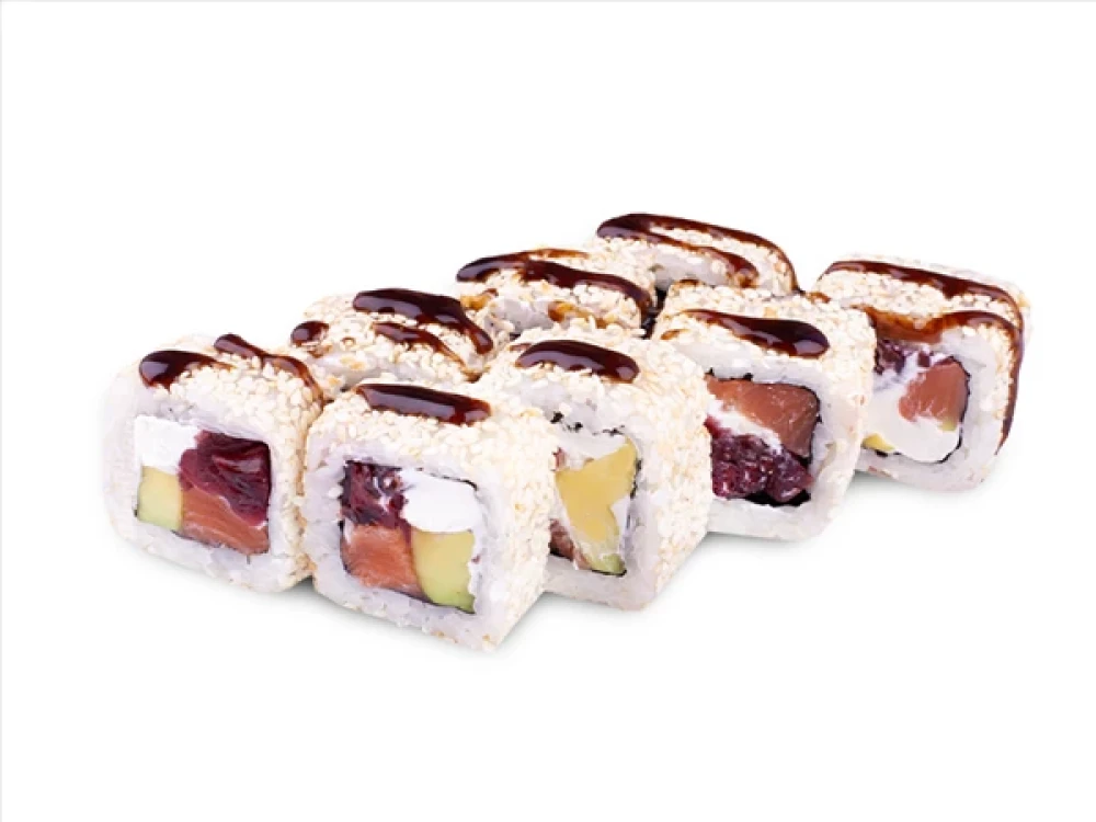 Лосось, сливочный сыр, авокадо, валеная клюква, кунжут, соус Унаги.