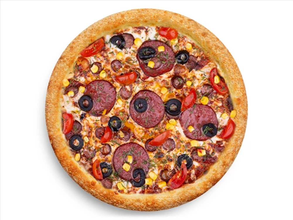 Соус Сацебели, сыр Моцарелла, колбаса Салями, колбаски охотничьи, маслины, томаты Черри, кукуруза, укроп.