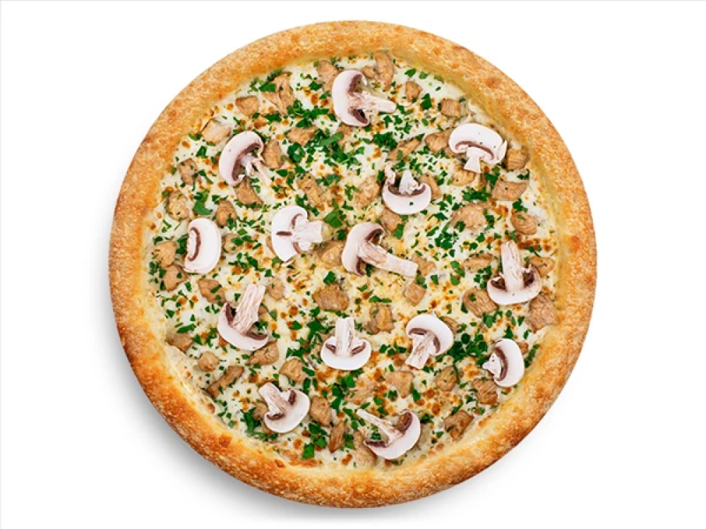 Соус сливочный, сыр Моцарелла, куриное филе, грибы шампиньоны, укроп.
