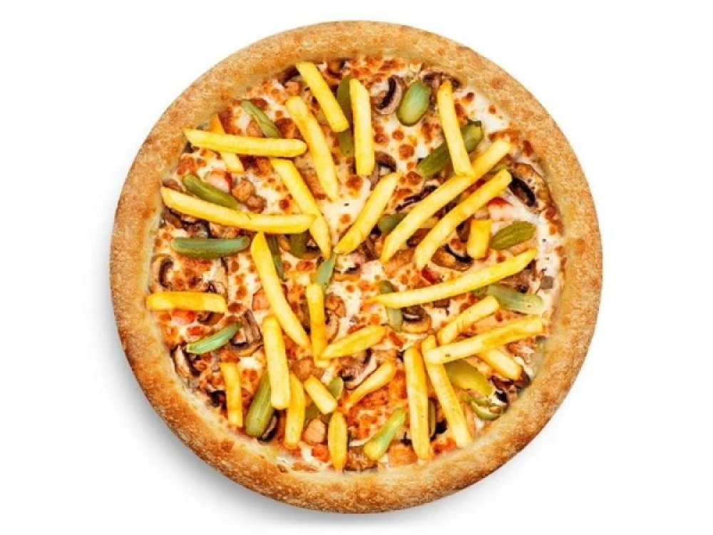 Соус сливочный, сыр "Моцарелла", куриное филе, копчёное куриное филе, грибы "Шампиньоны", корнишоны, картофель "Фри".