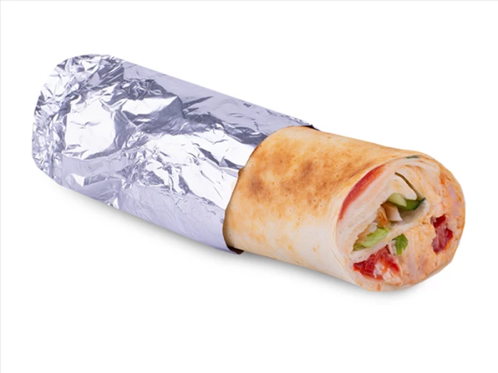 Тортилья, копченое куриное филе, соус "Цезарь", сыр "Моцарелла", салат "Айсберг", огурец, томаты "Черри", сыр "Пармезан", соус "Макси Бургер".
