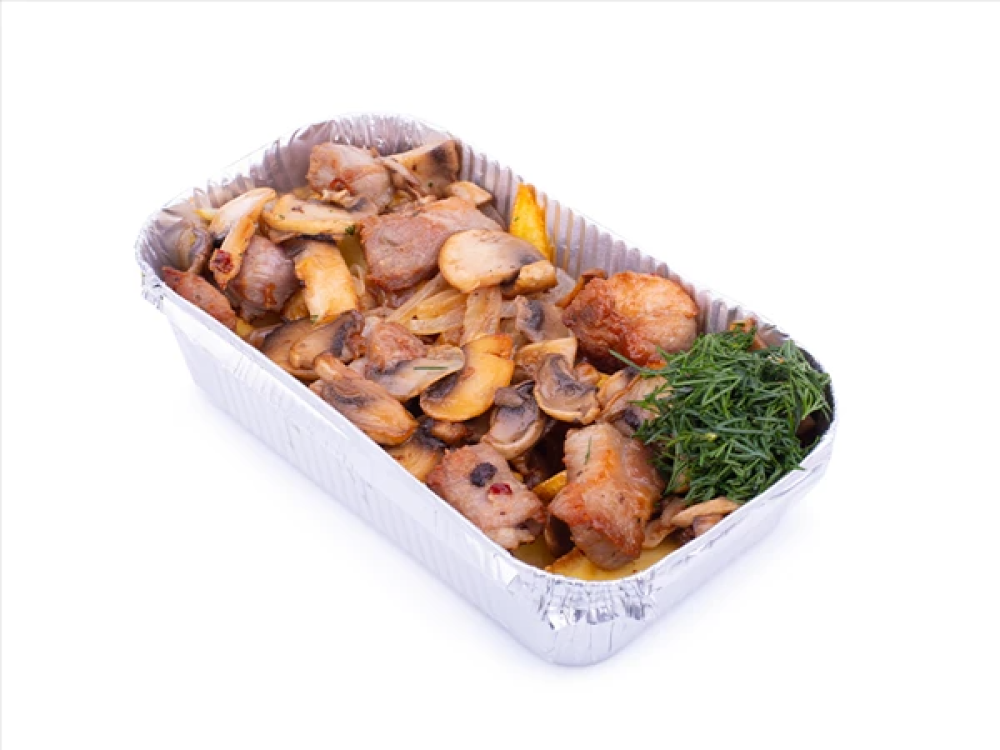 Картофель по-селянски, свинина, лук, грибы "Шампиньоны", зелень.