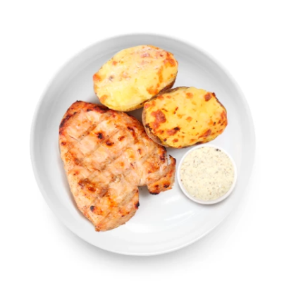 Печеный картофель с грибным соусом и куриным стейком
