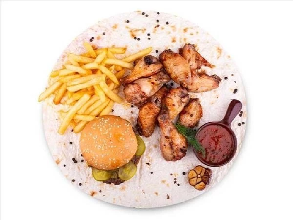 Гамбургер, крылышки гриль 200 г, кетчуп, картофель фри 100 г.