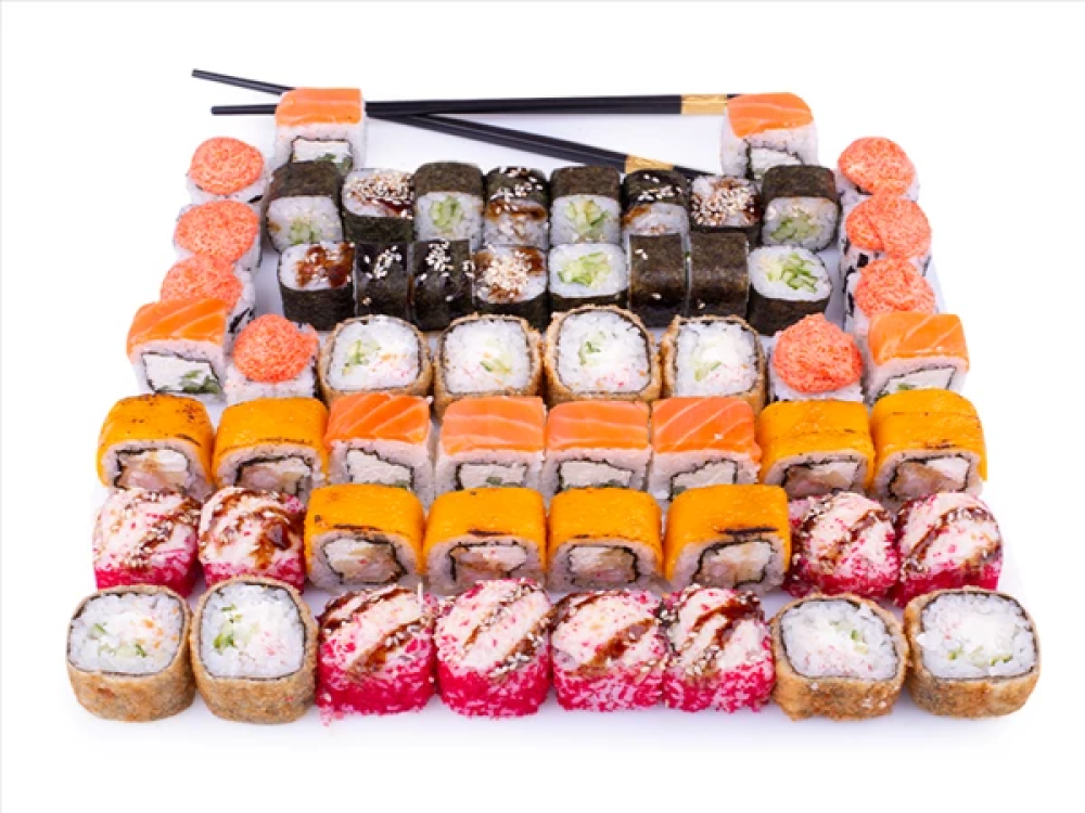 Филадельфия Лайт - лосось, сливочный сыр, огурец Филадельфия Чеддер - креветка, сливочный сыр, огурец, омлет Томаго, сыр Чеддер, соус Унаги Маки угорь - угорь, соус Унаги, кунжут Яки Лава - копчёное куриное филе, замес Лава, омлет Томаго, соус Унаги Темпура краб - замес крабовый микс, сливочный сыр, огурец Крабовый рай - сливочный сыр, омлет Томаго, икра Масаго, замес крабовый, соус Унаги Маки огурец - огурец, кунжут В составе: 56 роллов (шт) *бесплатно, в комплекте: 3 палочки, 3 имбиря, 3 соевых соуса, 3 васаби *заявленный вес может отличаться на +- 5% *все фото блюд являются выставочными и могут незначительно отличаться