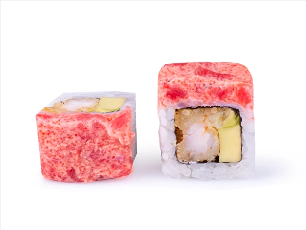Креветка, тунец, авокадо, икра "Масаго", соус "Спайси", соус "Унаги".