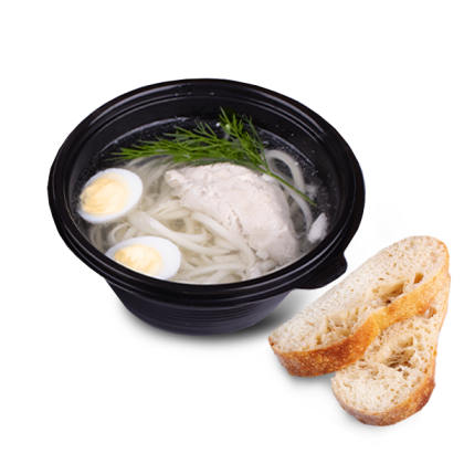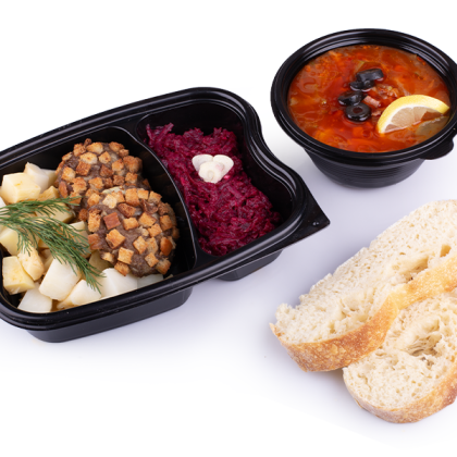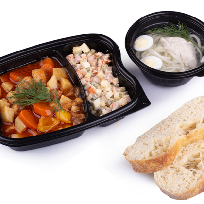 Традиционный красный борщ с курицей. Два кусочка домашнего хлеба *заказать можно по предварительному заказу, за один день *в комплекте сервисный набор и приборы *доставка с 12:00 до 15:00