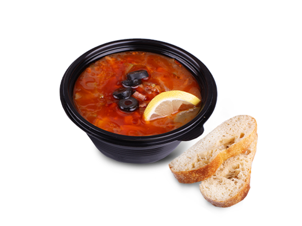 Наваристая солянка с копченостями. Два кусочка домашнего хлеба *заказать можно по предварительному заказу, за один день *в комплекте сервисный набор и приборы *доставка с 12:00 до 15:00