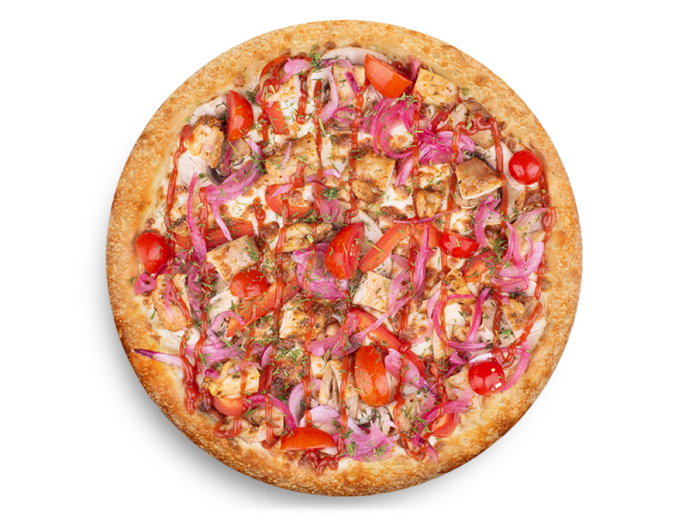 Сыр Моцарелла, соус Ранч, шампиньоны, куриный шашлык, болгарский перец, томаты Черри, лук Ялтинский маринованный, соус Кетчуп, укроп