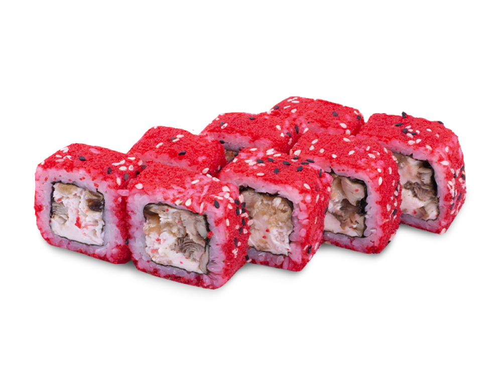 Угорь, крабовый микс, сливочный сыр, икра Масаго, кунжут