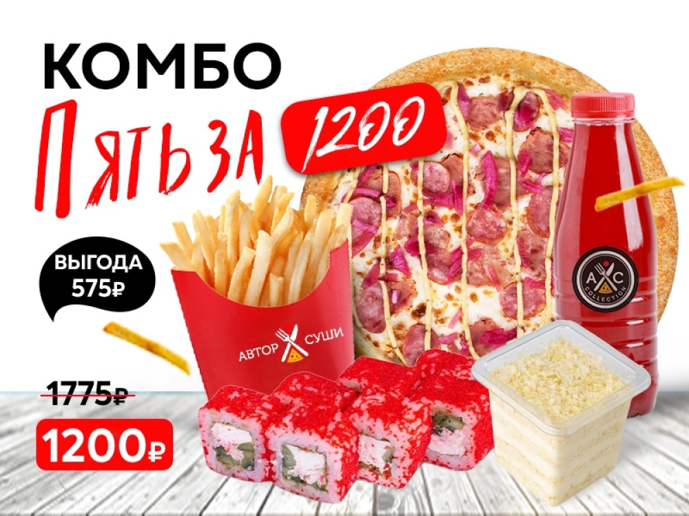 Ролл Филадельфия краб - Замес крабовый микс, сливочный сыр, огурец, икра Масаго Пицца Макси 25 см - Сыр Моцарелла, ветчина, колбаса шашлычная, маринованный ялтинский лук, соус медово-горчичный, соус Макси Бургер Картофель Фри - Ароматный, нарезанный соломкой, картофель. Обжаривается во фритюре Ягодный Морс - из сезонных ягод (малина, красная смородина, вишня) Фирменный Наполеон - маленькая история, насыщенная вкусами и ароматами, которая дарит мгновения счастья и тепла *заявленный вес может отличаться на +- 5% *все фото блюд являются выставочными и могут незначительно отличаться