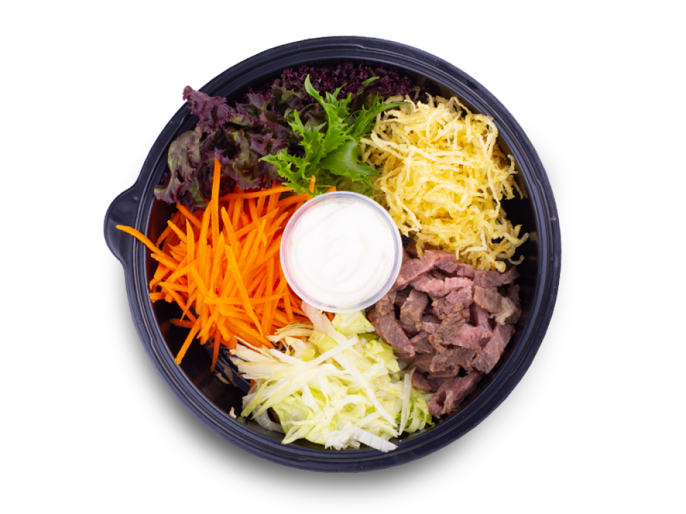 Говядина, морковь по-корейски, капуста белокочанная, картофель Пай, майонез, зелень Лола