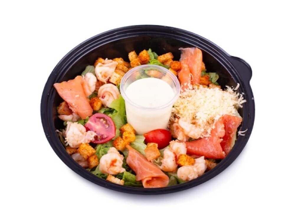 Изысканное блюдо, которое сочетает в себе нежный лосось, сочные креветки и хрустящий листовой салат. Подается с классическим соусом "Цезарь", сыром "Пармезан" и гренками. Оригинальное сочетание морепродуктов и свежих овощей делает этот салат незабываемо вкусным и питательным.
