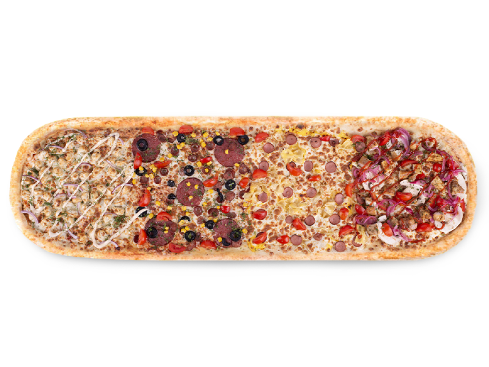 Сыр Моцарелла, сыр Чеддер, сыр Пармезан, лапша Фарфалле, сосиски молочные, пельмени отварные, салями, охотничьи колбаски, куриный шашлык, кукуруза маринованная, маслины, томаты Черри, лук Ялтинский, лук Ялтинский маринованный, шампиньоны, болгарский перец, укроп, соус кетчуп, соус Ранч, соус Макси бургер, соус Сацебели, соус сырно-сливочный