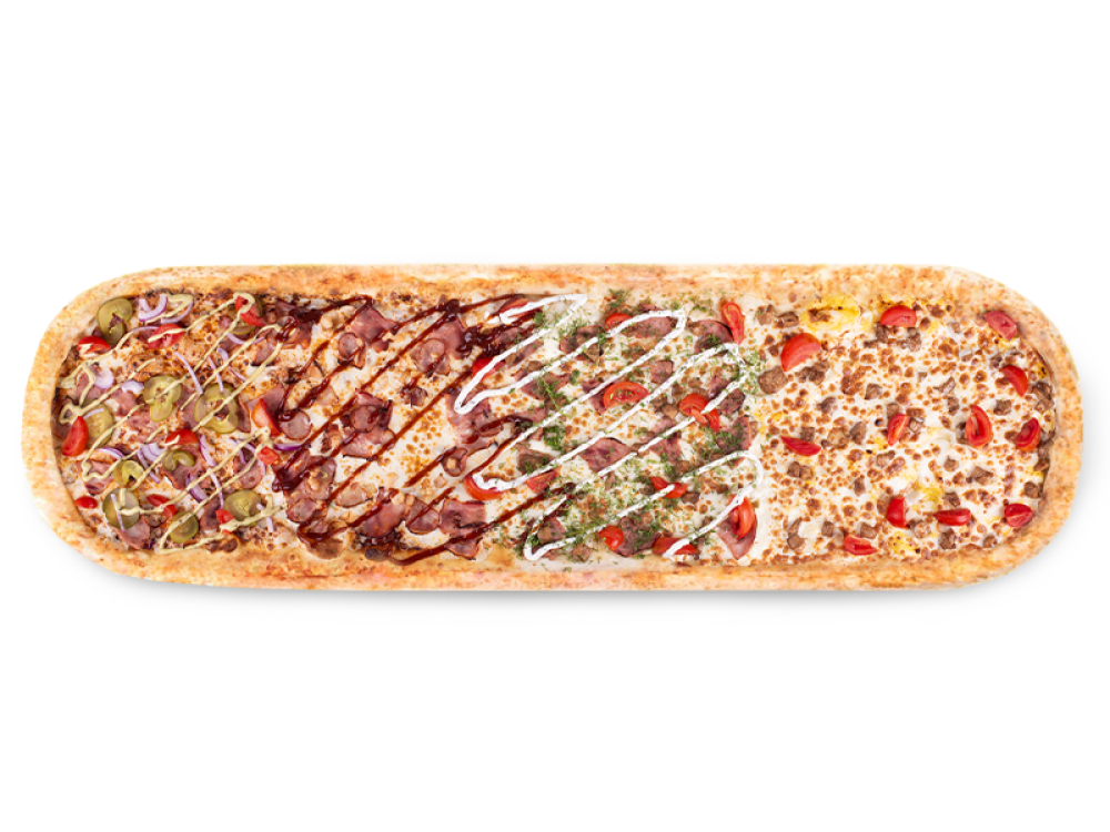 Сыр Моцарелла, ветчина, бекон, колбаса шашлычная, куриное филе копченое, лук карамелезированный, лук Ялтинский, огурец маринованный, томаты Черри, соус медово-горчичный, соус BBQ, соус Ранч, соус томатный, соус сливочный, соус сырно-сливочный, укроп