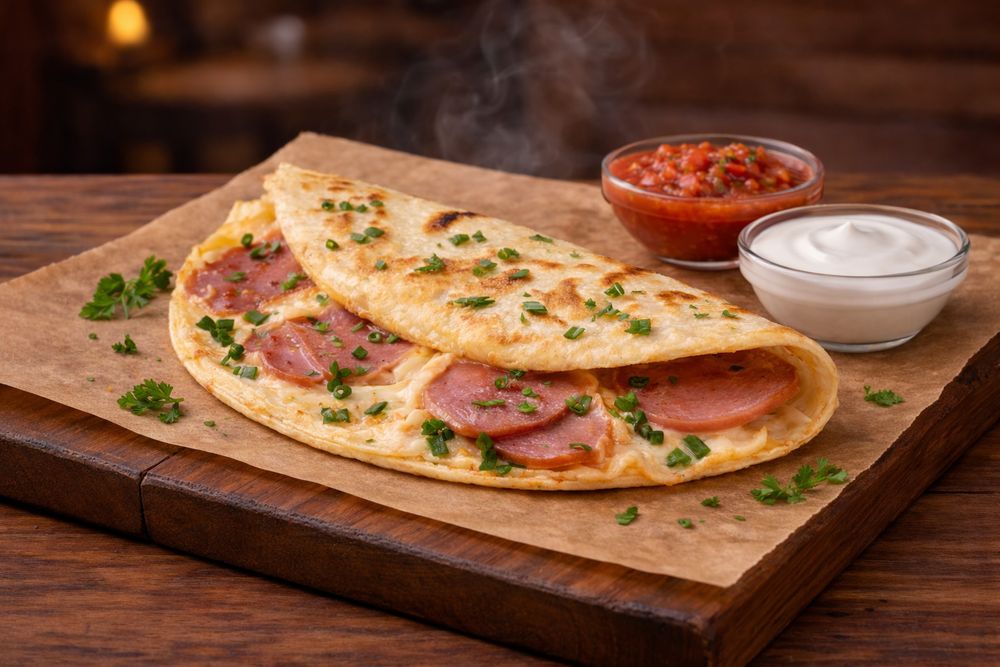Нежный, воздушный омлет, внутри которого скрывается классический дуэт сочной ветчины и ароматных грибов, обжаренных до золотистого цвета. Всё это бережно завернуто в тонкую пшеничную тортилью и подогрето до легкого хруста. Идеальный баланс текстур и вкуса, который превращает обычный завтрак в маленькое гастрономическое удовольствие
