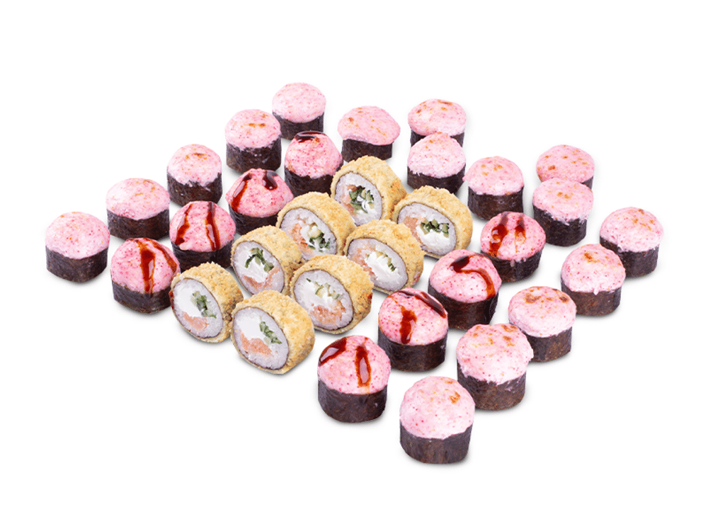Запеченный "Эби с креветкой" - Креветка, замес креветочный, сливочный сыр, омлет Томаго Запеченный "Ролл с креветкой" - Креветочный замес, сливочный сыр, омлет Томаго Запеченный "Краб с креветкой" - Замес крабовый микс, замес креветочный, сливочный сыр, омлет Томаго Ролл "Темпура Лосось" - Лосось, сливочный сыр, огурец В составе: 32 ролла (шт) *бесплатно, в комплекте: 3 палочки, 3 имбиря, 3 соевых соуса, 3 васаби *заявленный вес может отличаться на +- 5% *все фото блюд являются выставочными и могут незначительно отличаться