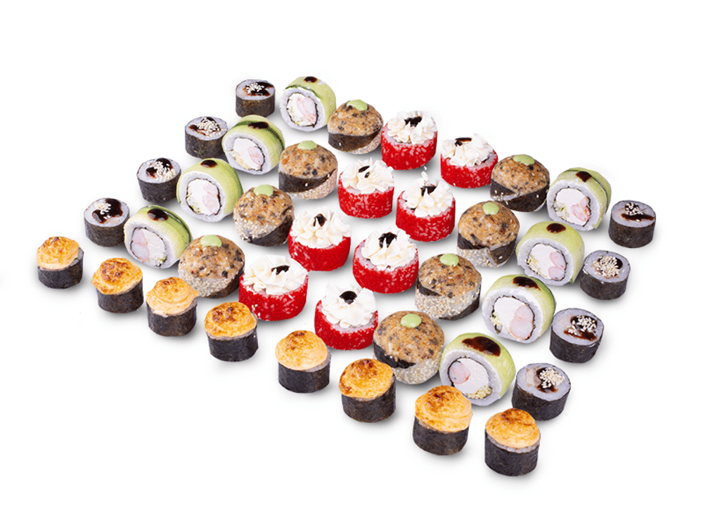 Ролл Кики - Креветка, сливочный сыр, салат Айсберг, огурец, соус Унаги Маки Угорь - Угорь, кунжут, соус Унаги Запеченный лосось-спайси - Лосось, огурец, соус Спайси Ролл Калифорния Сырная - Замес крабовый микс, сливочный сыр, огурец, икра Масаго, соус Унаги Запеченный с угрём и лососем - Лосось, замес с угрём, сливочный сыр, огурец, соус Васаби В составе: 40 роллов (шт) *бесплатно, в комплекте: 3 палочки, 3 имбиря, 3 соевых соуса, 3 васаби *заявленный вес может отличаться на +- 5% *все фото блюд являются выставочными и могут незначительно отличаться
