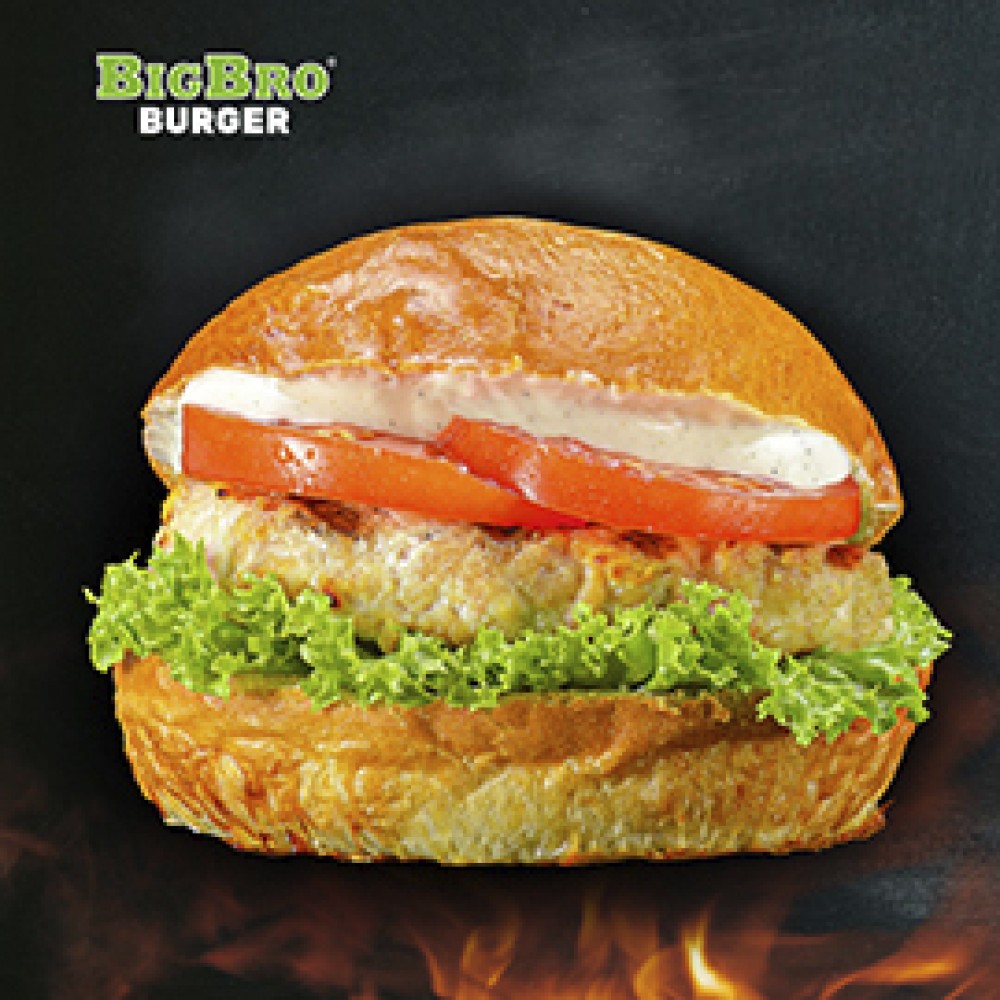 Фирменная белая булочка,котлета куриная, лист бионда, помидор, маринованные огурцы, кетчуп, горчица.