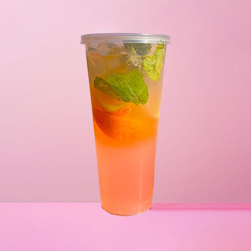 Спрайт, дольки апельсина, дольки лимона, сироп "Бабл Гам", мята, лед.
