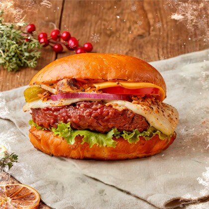 Тортилья сырная, котлета на выбор, жареные грибы, хашбраун, сыр чеддер, лук жареный, лук красный маринованный, свежий помидор, огурцы консервированные, бионда, соус «1000 островов», соус грибной.
