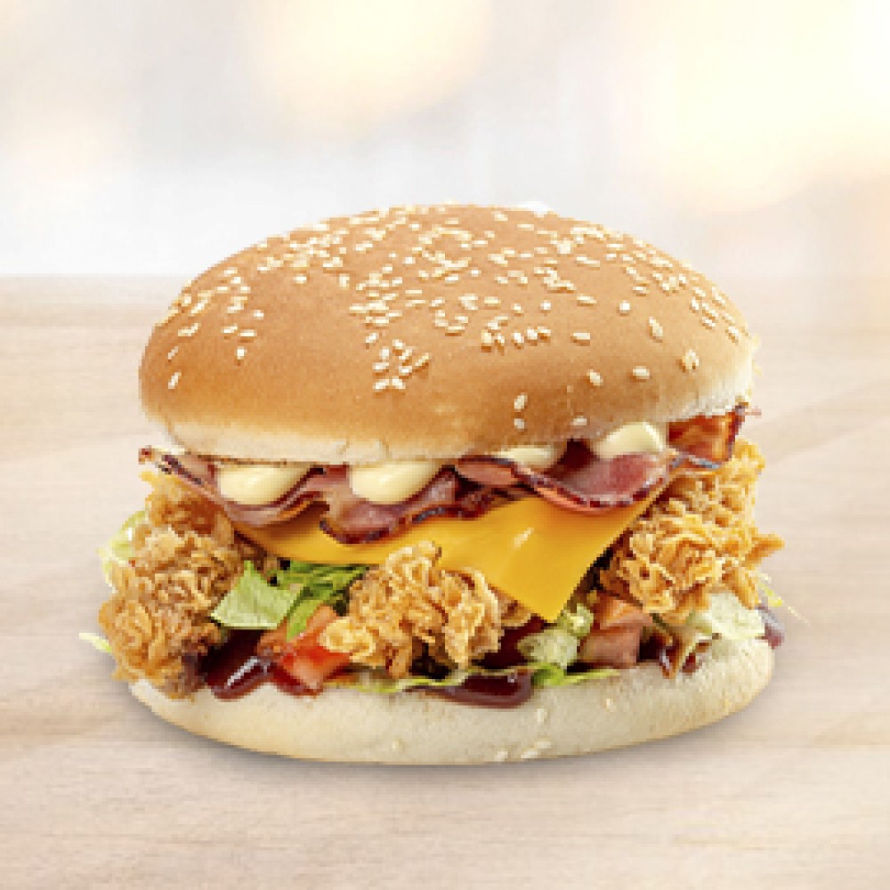 Булочка с кунжутом, куриное филе, соус барбекю, соус майонез, сыр чеддер, бекон варено-копченый, томаты свежие, салат Айсберг.