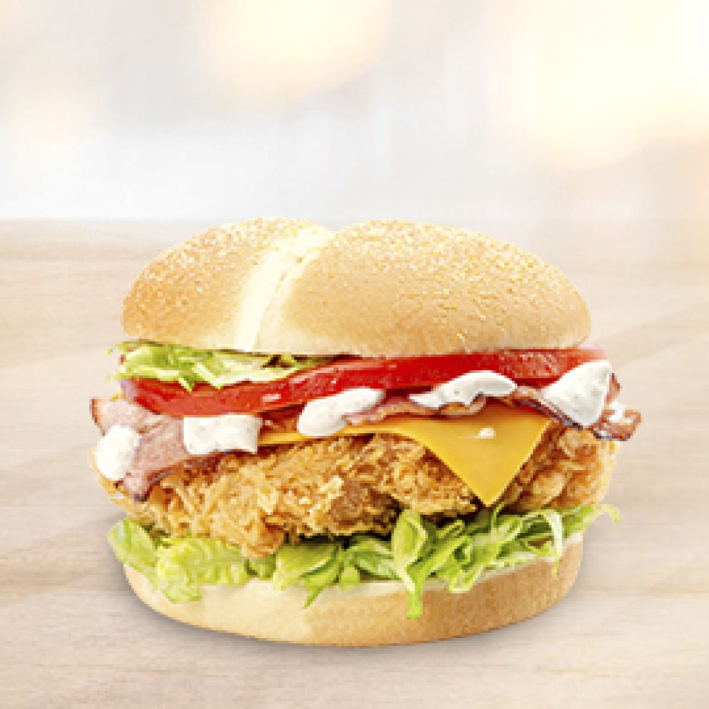 Булка пшеничная с кукурузной посыпкой, помидор свежий, бекон варено-копченый, сыр чеддер, соус цезарь, салат Айсберг, куриное филе.