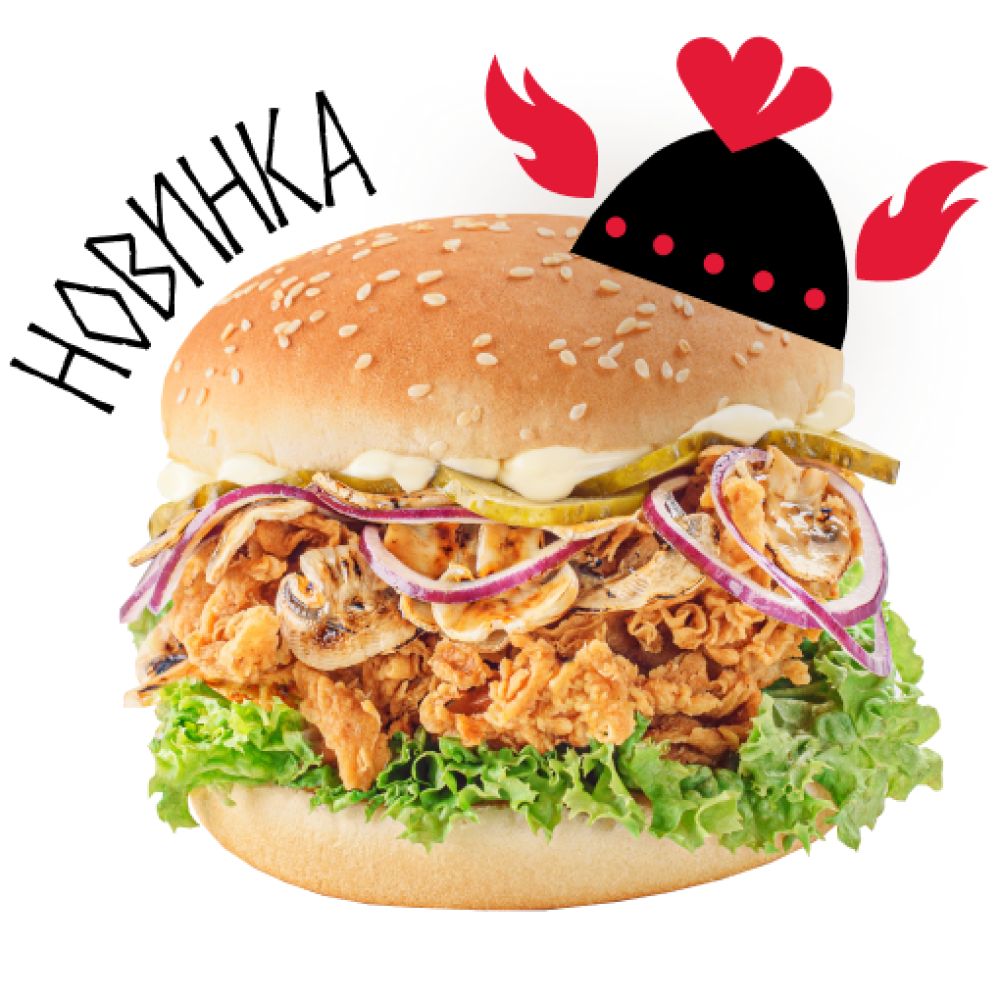 Просто хрустящая курочка, красный лук, маринованный огурец, грибочки, грибной соус и хрустящий салат? Хммм. этот вкус обманет ваше ожидания.