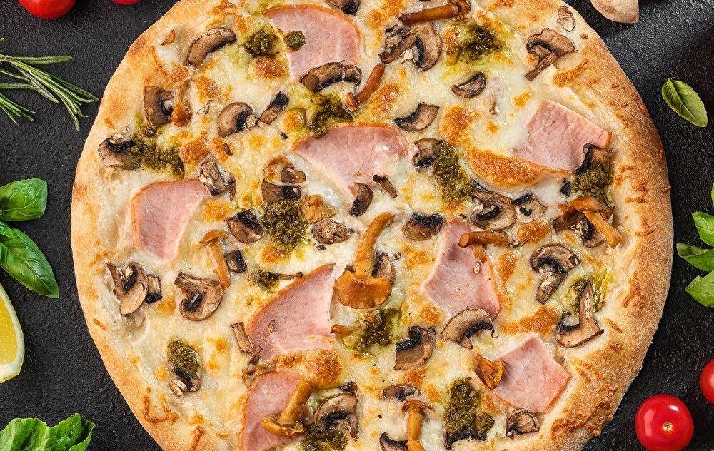Тесто, соус ранч, грибы шампиньоны, моцарелла, балык cвинoй, опята маринованные, соус песто, грецкий орех