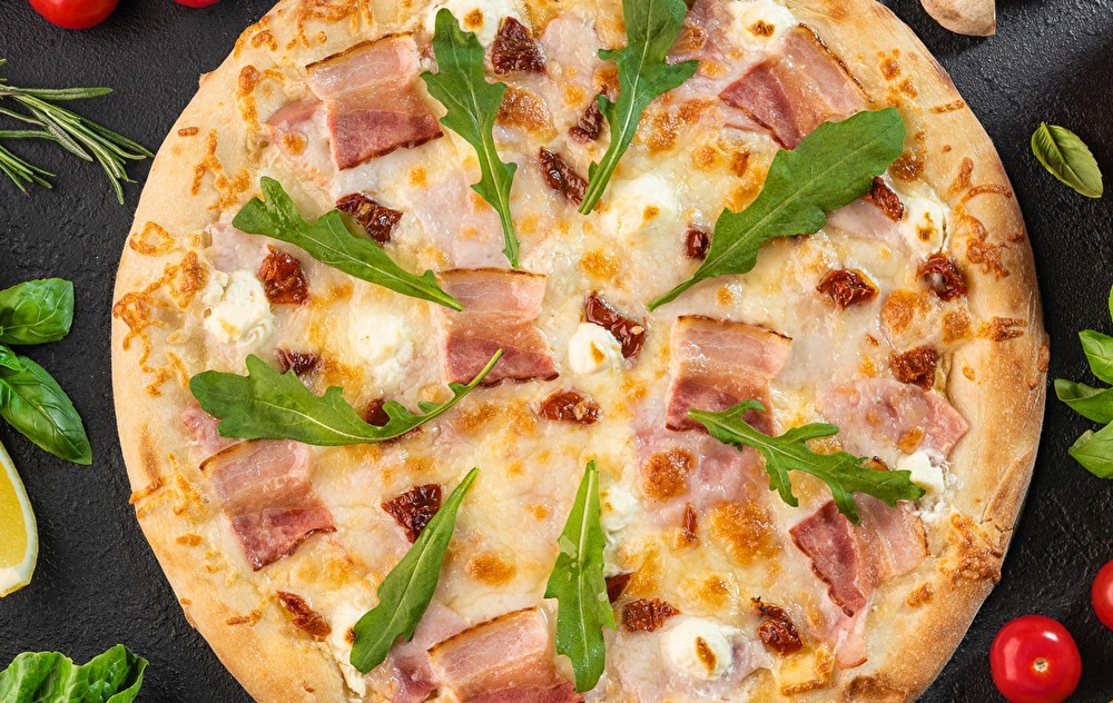 Тесто, соус ранч, моцарелла, бекон, ветчина, балык cвинoй, томаты вяленные, сыр cremette, руккола