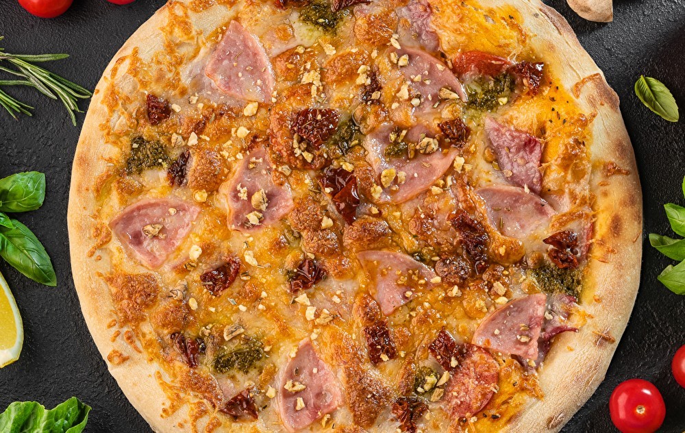 Тесто, соус красный, пепперони, ветчина, буженина говядина, подпыл, томаты вяленые, соус песто, грецкий орех, моцарелла