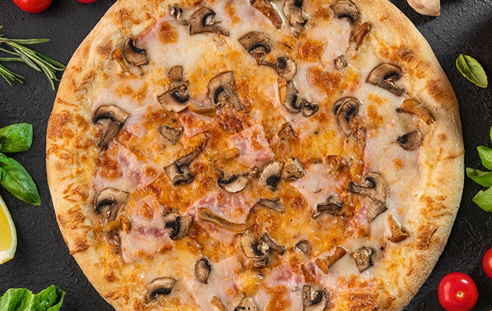Тесто, соус красный, моцарелла, опята маринованные, ветчина, грибы шампиньоны