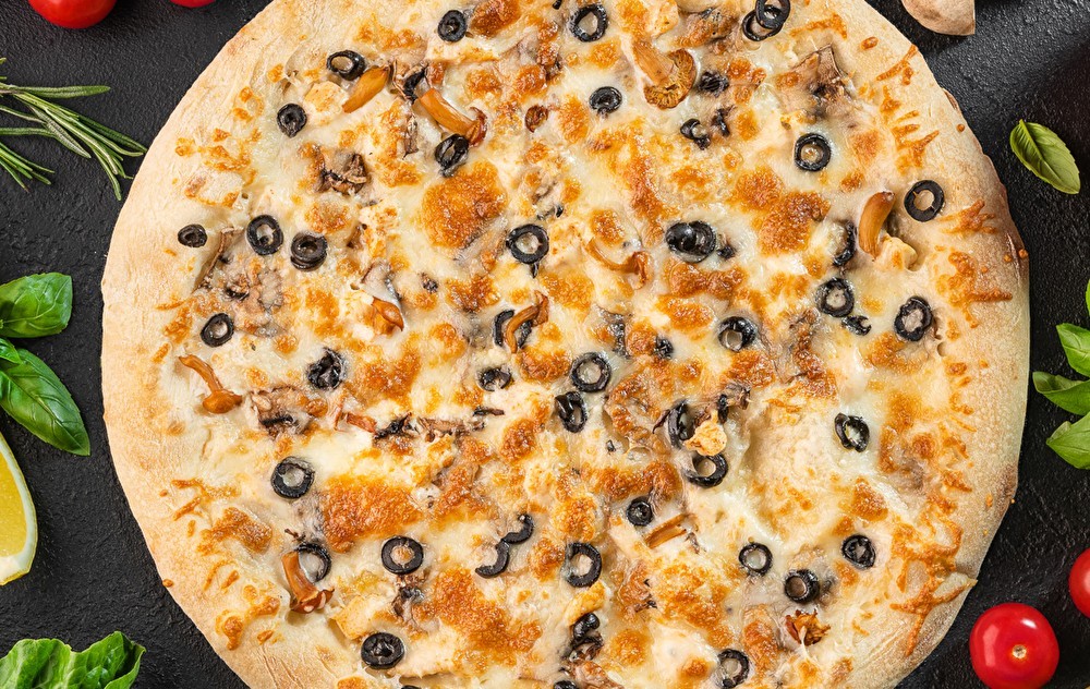 Тесто, соус ранч, моцарелла, грибы шампиньоны, маслины, опята маринованные, куриное филе