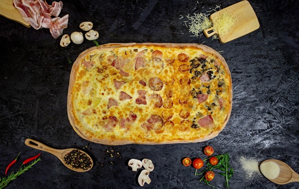 Тесто, соус ранч, курица, ананас консервированный, моцарелла, грибы шампиньоны, пепперони, салями, бекон, ветчина