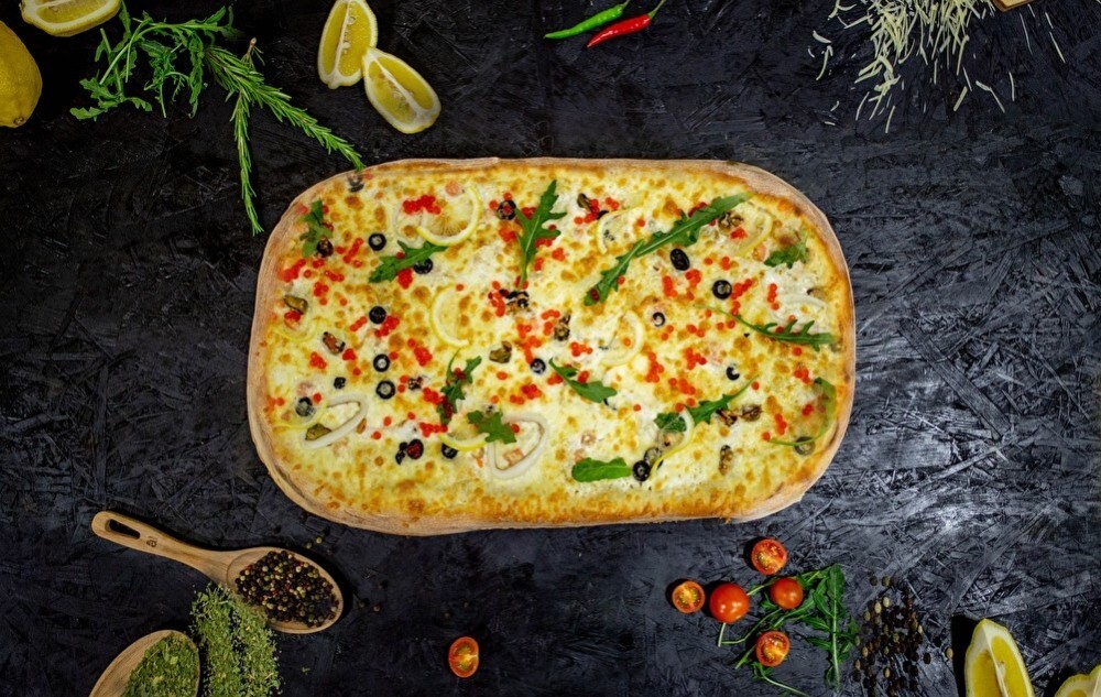 Тесто, соус ранч, моцарелла, креветки, кальмар, мидии, красная рыба, маслины, икра, руккола, лимон