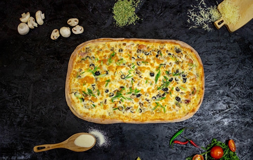 Тесто, соус ранч, курица, моцарелла, шампиньоны, маслины, зеленый лук