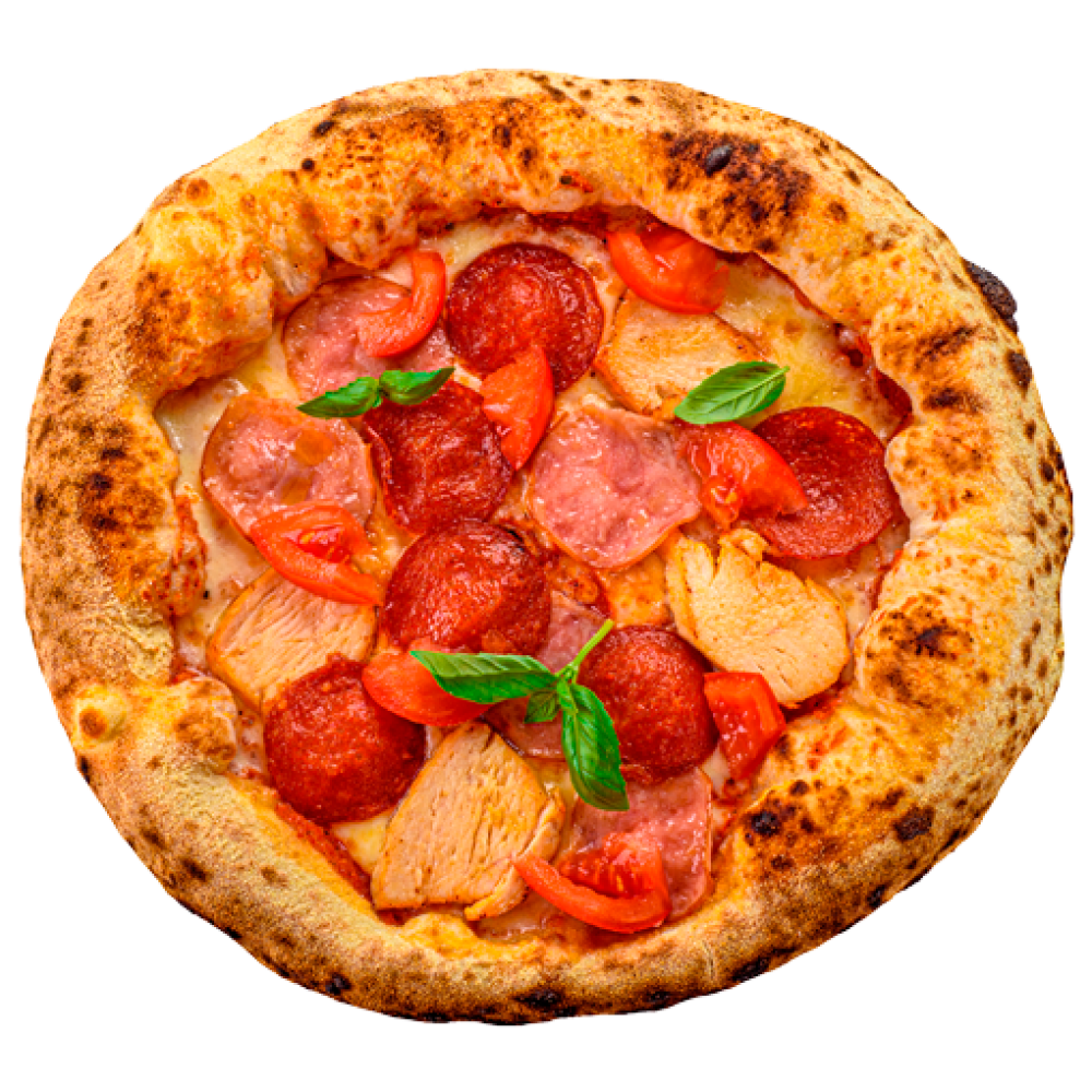 Маслины, помидоры, курица, пепперони, ветчина, моцарелла, соус томатный.